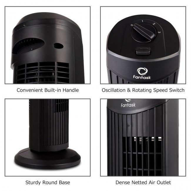 Tower design fits easily into corners and areas where space is limitedDense netted air outlet protects your finger from unexpected injuryDesigned for quiet and efficient operation in home-environment or workplace3 wind speed settings (Low/Middle/High) for optimum comfortOscillation can make the whole room coolLow noise winding and low power consumptionFeatures a sturdy round baseAssembles easily with no tools required