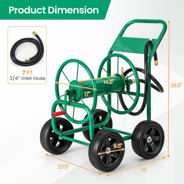 Overview-Large diameter hose reel fits 330ft of 3/4" or 5/8" hose, or 400ft of 1/2" hose(not included)-7ft leader hose facilitates easy connection to the water system-Heavy-duty structure with powder coating can support a long time-Brass fitting connector features good quality to prevent leaking-Premium large rubber wheels move smoothly on various grounds-Humanized rotatable handle helps you wrap the hose effortlessly-Suitable for watering flowers, showering pets or washing cars-Low center of gravity design effectively avoids tipping the hose cart-Convenient grip is easy for you to move the cart in anywhere you want-Numbered parts and detailed instruction ensure hassle-free assembly
