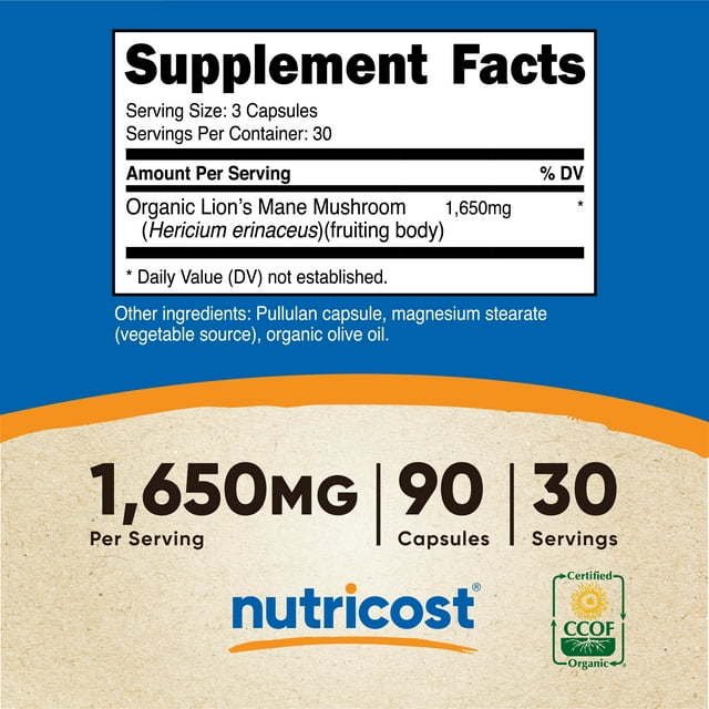 Unlike many similar products, Nutricost Lion's Mane Mushroom has been certified Organic by CCOF. Look for the certification on the bottle. There are 700mg of Organic Lions Mane per capsule and 2100mg per serving. There are 90 veggie capsules - 30 Servings In each bottle for a full month supply. This product is non-GMO, gluten free, soy free, and vegan friendly. Easily add organic lions mane mushroom to your daily regimen. Nutricost, located and headquartered in the USA, only uses the best ingredients to ensure maximum quality and to help you feel your best! By keeping our supplement recipes simple and clean, you get the best experience possible with Nutricost. Our supplements are manufactured in a GMP-compliant and FDA-registered facility; and each batch of every product is tested by independent, ISO-accredited laboratories.
