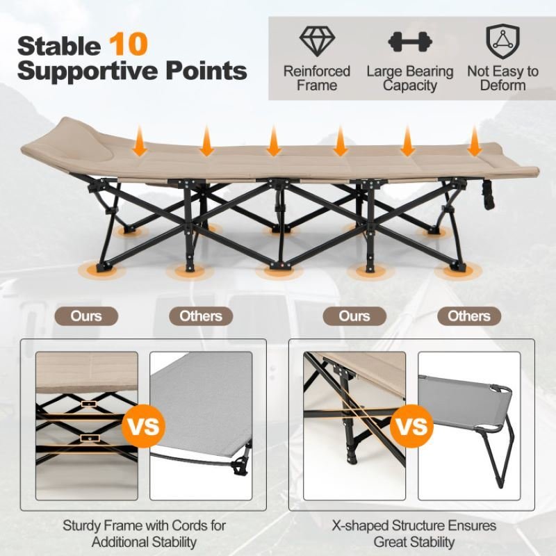 1.The camping cot is designed with a stable metal frame and 10 support legs, ensuring unparalleled stability and eliminating any worries about wobbling or instability.